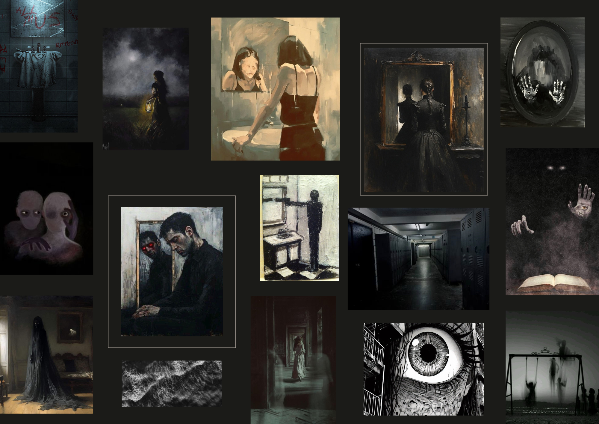 My mood board is centered around the theme of seeing ghosts as it aligns with the vision I have for my movie opening. To enhance the suspense and mystery I selected a collection of dark, haunting imagery, which I believe will perfectly set the tone for my final project.I incorporated sneaky clues within the images, hinting at some elements of the setting and storyline in order to make it more intriguing.