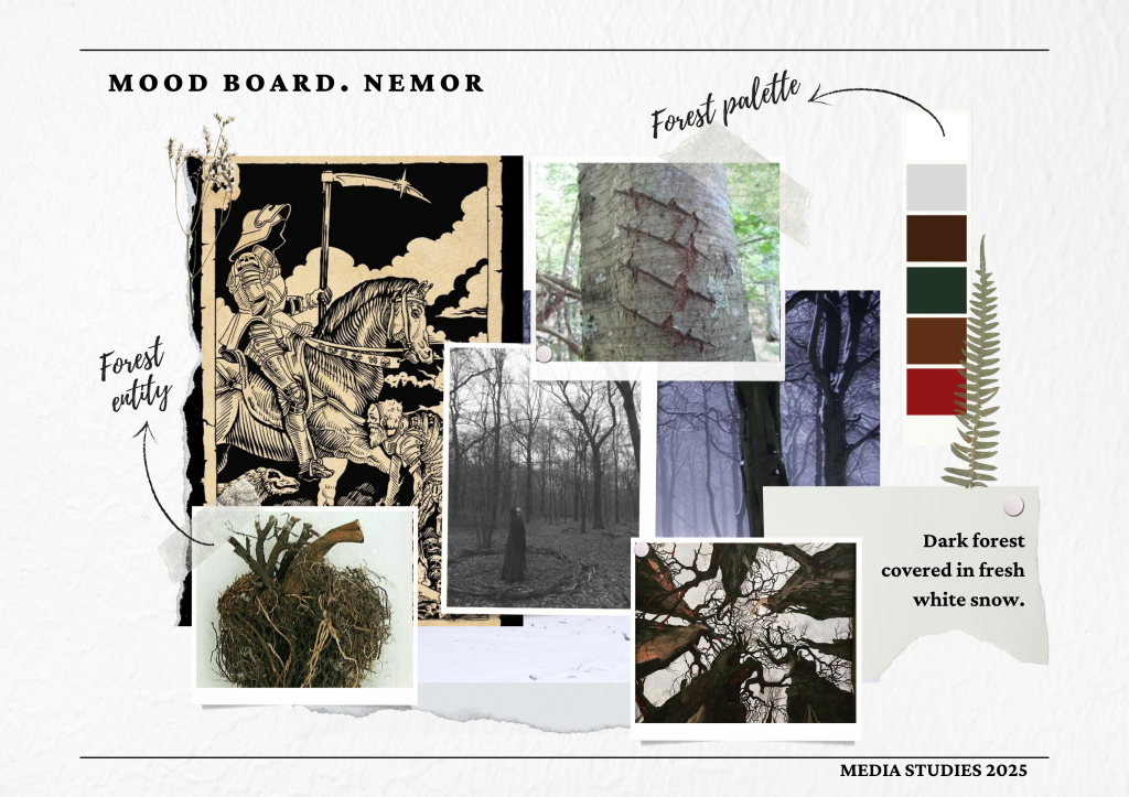 For the title, we wanted something that connects both to the forest and mysterious nature of tarot cards. After ruminating for about 30 minutes we had an idea to search for Latin words that can relate to our movie and also “sound intriguing”. While exploring various Latin words related to the forest, we landed on “Nemor,” which means “a grove of trees.” This title perfectly ties the natural elements of the film.