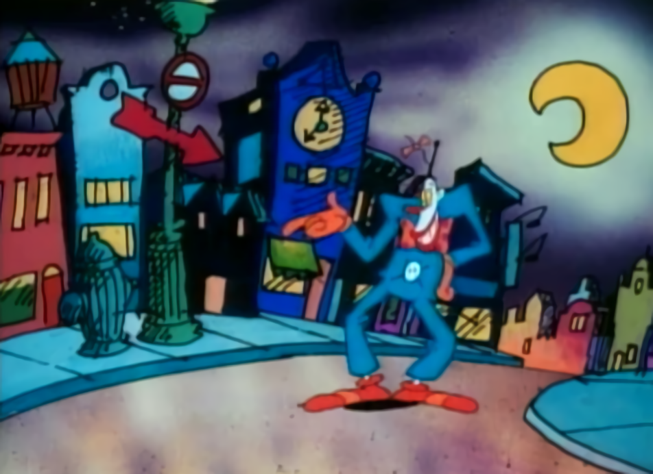 I usually try to stay away from backdrops with bright colours but I’m decently surprised at how well they’ve been used in Johnny Bravo. I also like how every building is slightly slanted. I remember reading that Jim Smith used to also skew shapes in backgrounds because they made the scenery feel more interesting while also not being distracting.