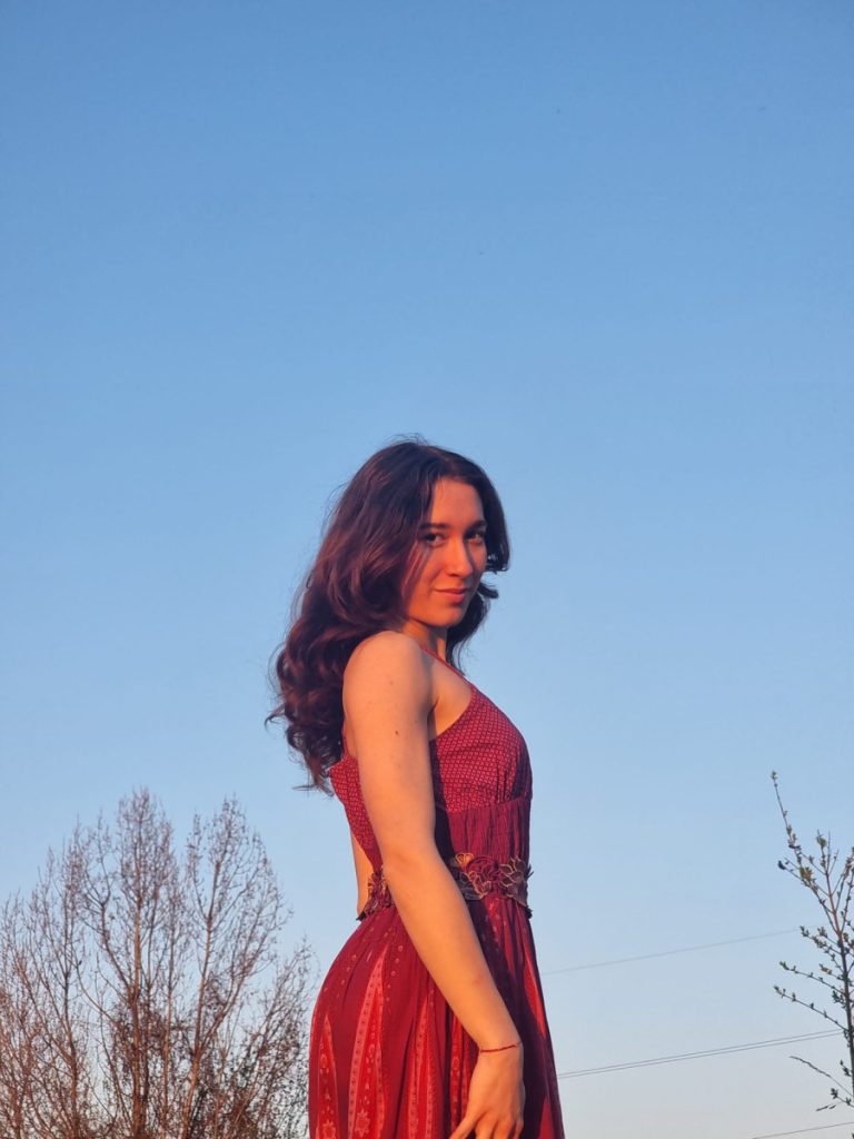 After my 2nd photoshoot though, I had my camera with me, and Ale and I did a few trials for this photoshoot. This was planned as I was also dressed up in the red dress I was going to wear. We took some photos in trees, in front of trees, and from low-angles. With pink, white, and yellow-flowered trees in the background, separately. I did not like any of them. The background was too crowded, there were too many branches that just made the dress get lost and not be the main focus. After many trials and errors, I finally decided that the idea had to be changed. Looking over more pinterest boards, I saw another thing that caught my eye. Low angle photos with only the sky visible. This was perfect as for this there is a small hill next to my house on which I can go take photos from at golden hour. Unfortunately we couldn’t try it out and see if these would turn out good cause there were too many trees to get a photo of just the models and the clear sky.