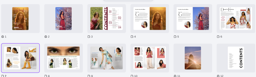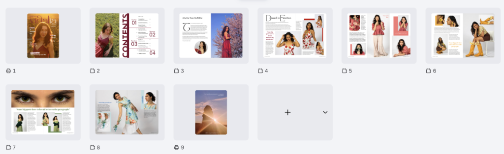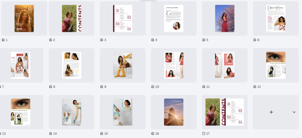 In the final version, I switched yellow with pink, so that the first two page pairs have one model, and the rest have the other. This would also help me separate the pages when I post them on Issuu, as the max for free publications in 10 pages.